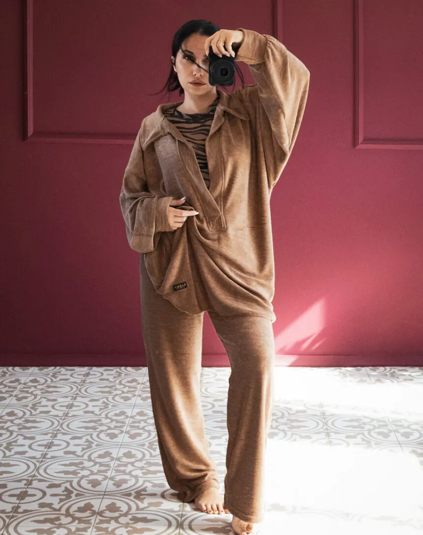 Ψηλόμεσο παντελόνι από εξαιρετικά απαλό πετσετέ ύφασμα (terry towelling). Με άνετη γραμμή και ρευστή πτώση, προσφέρει κομψότητα και απόλυτη άνεση. Κατασκευάζεται στην Ελλάδα.