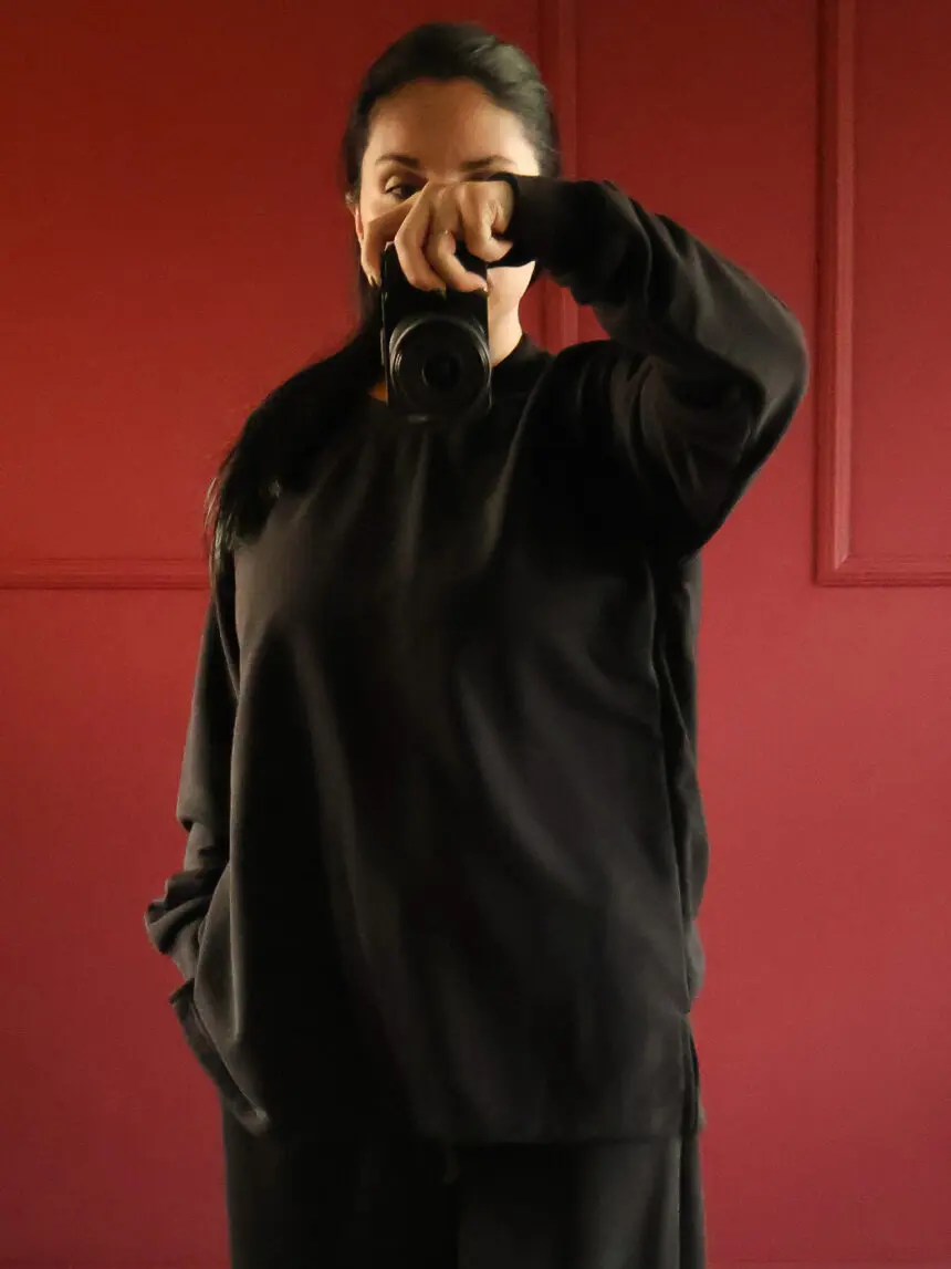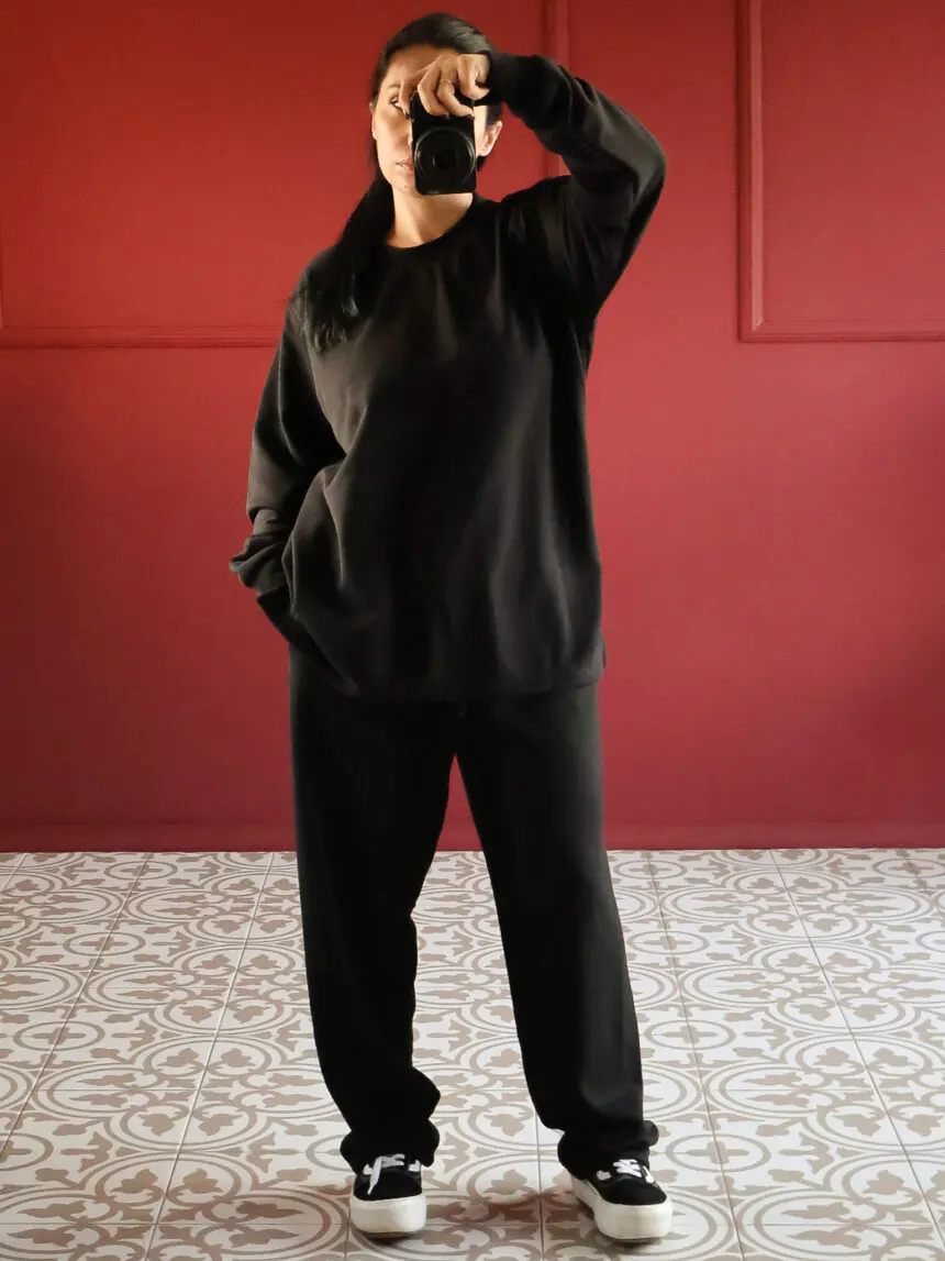 Μαύρο φούτερ σε oversized γραμμή, με στρογγυλή λαιμόκοψη και μακριά μανίκια. Κατασκευασμένο από μαλακό και άνετο ύφασμα, ιδανικό για cozy εμφανίσεις αλλά και casual streetwear looks. Συνδυάζεται εύκολα με τζιν, φόρμες ή σορτς, δίνοντας minimal αλλά στιλάτο αποτέλεσμα.