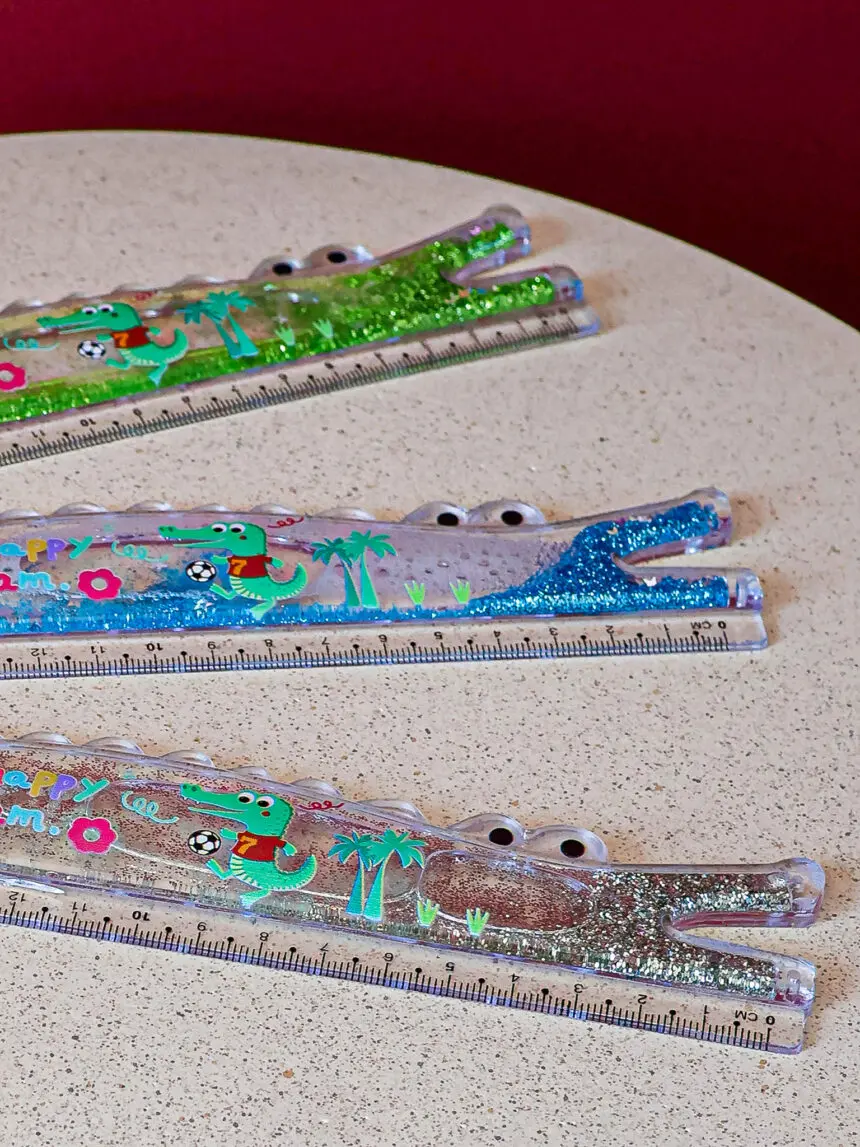Παιδικός χάρακας με διασκεδαστικό σχέδιο κροκοδείλου και γκλίτερ υγρού που κινείται. Διαθέσιμος σε διάφορα χρώματα (πράσινο, μπλε, ασημί). Ιδανικός για το σχολείο, κάνει τις μετρήσεις πιο ευχάριστες και χαρίζει χαμόγελο σε κάθε μικρό μαθητή.