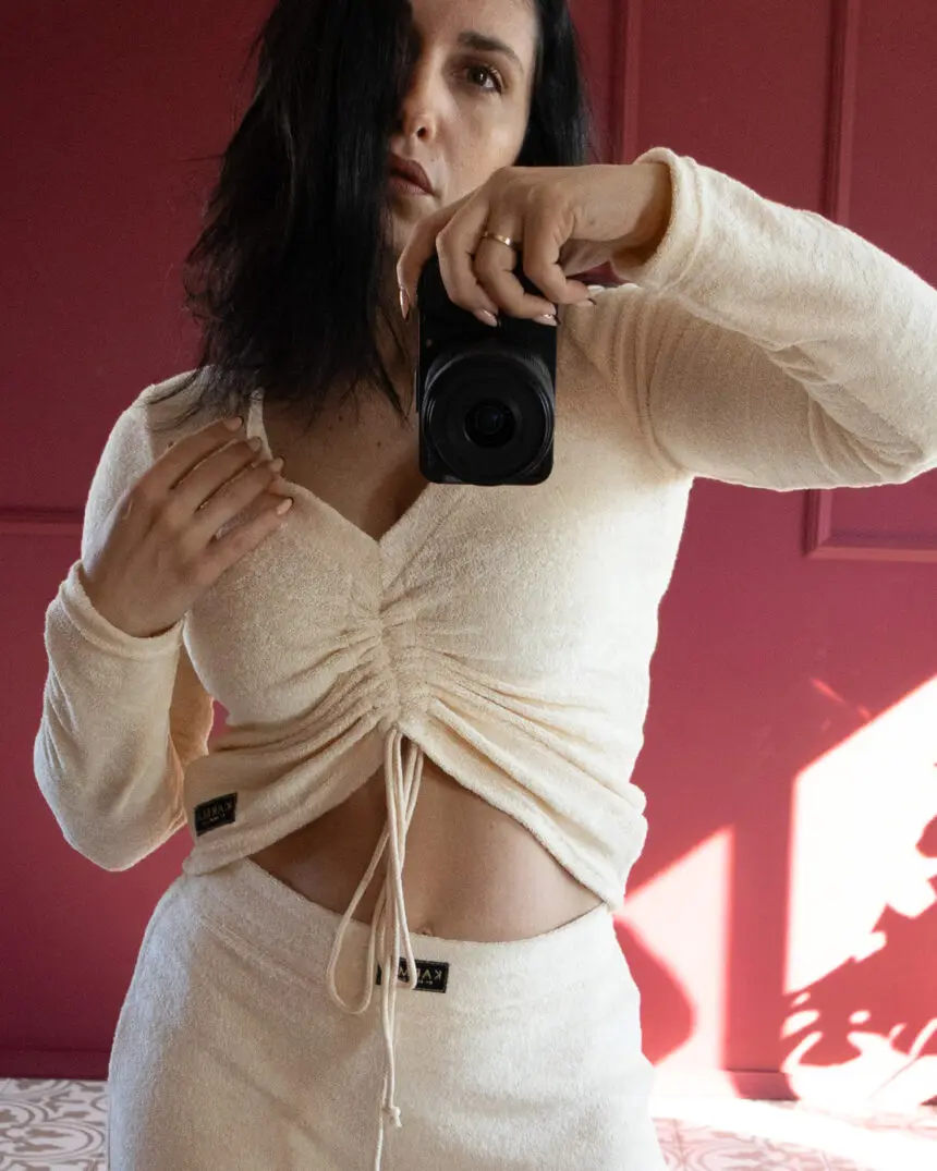 Απαλή μπλούζα με μακριά μανίκια από ελαφρύ πετσετέ ύφασμα (terry towelling). Διαθέτει V λαιμόκοψη και ρυθμιζόμενη σούρα με κορδόνι στο μπροστινό μέρος για κολακευτική εφαρμογή. Συνδυάζει άνεση και κομψότητα — ιδανική για χαλάρωση, ταξίδια ή resort εμφανίσεις. Κατασκευάζεται στην Ελλάδα.