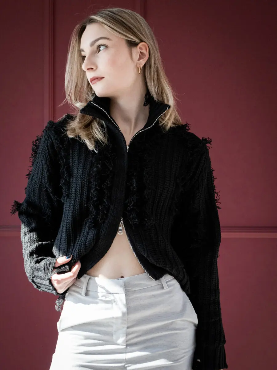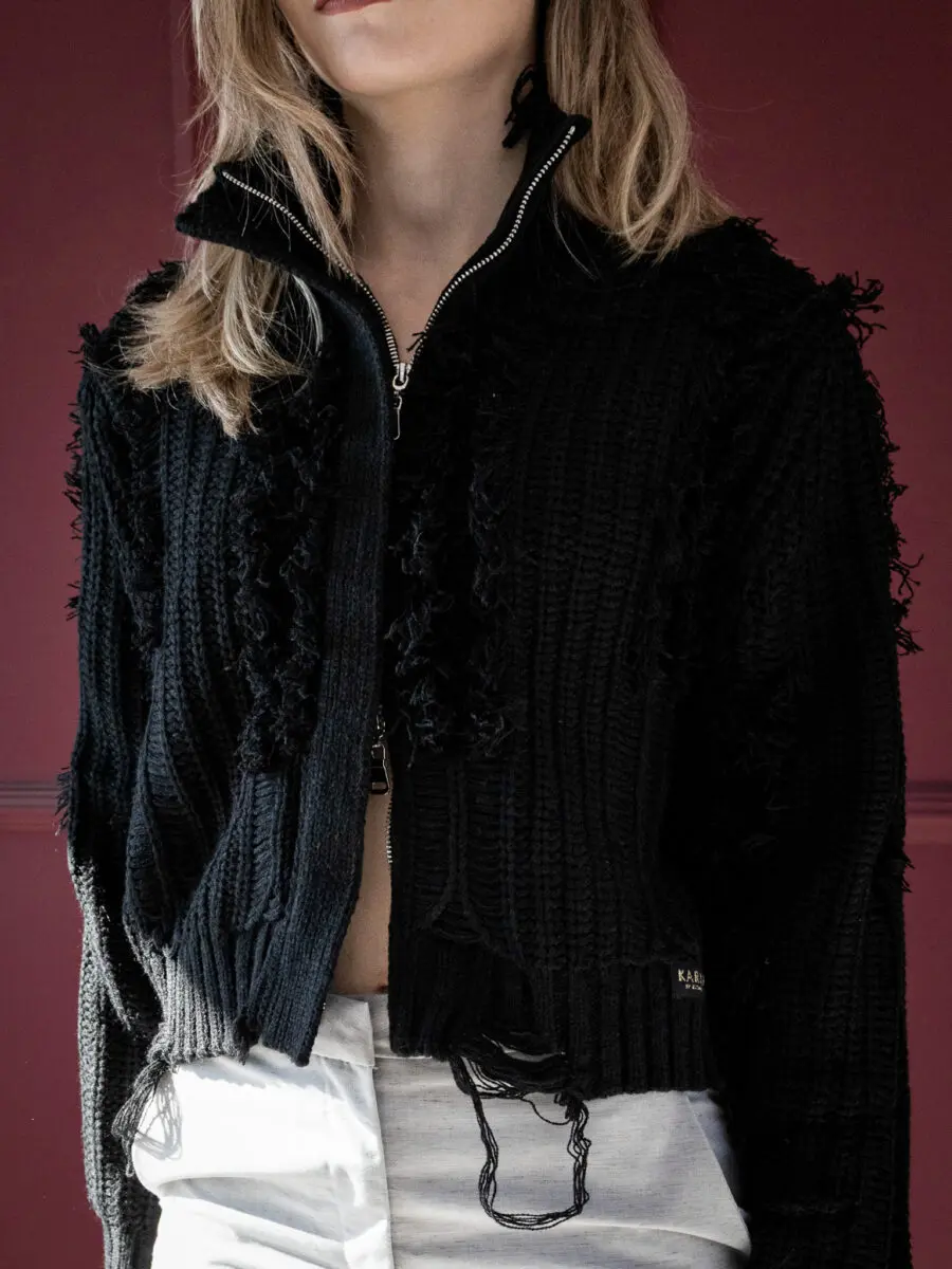 Μαύρη πλεκτή ζακέτα με σύγχρονο design και ιδιαίτερη υφή που συνδυάζει minimal γραμμές με edgy λεπτομέρειες.