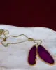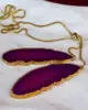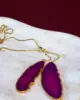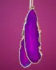 Μακρύ κολιέ με εντυπωσιακό μενταγιόν από φυσική πέτρα αχάτη σε μωβ απόχρωση, διακοσμημένο με χρυσή μεταλλική λεπτομέρεια στο περίγραμμα. Κάθε κομμάτι είναι μοναδικό χάρη στα φυσικά νερά της πέτρας. Ένα statement αξεσουάρ που αναδεικνύει κάθε εμφάνιση, από casual έως βραδινή.