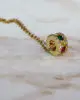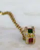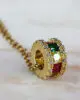 Κολιέ με εντυπωσιακό μενταγιόν σε κυλινδρικό σχήμα, διακοσμημένο με πολύχρωμες πέτρες (πράσινο, κίτρινο, κόκκινο) και λεπτομέρειες από λευκά κρυστάλλια. Σε χρυσό τόνο, προσφέρει λάμψη και χρώμα σε κάθε εμφάνιση. Ιδανικό για να φορεθεί μόνο του ως statement κομμάτι ή σε layered συνδυασμούς.