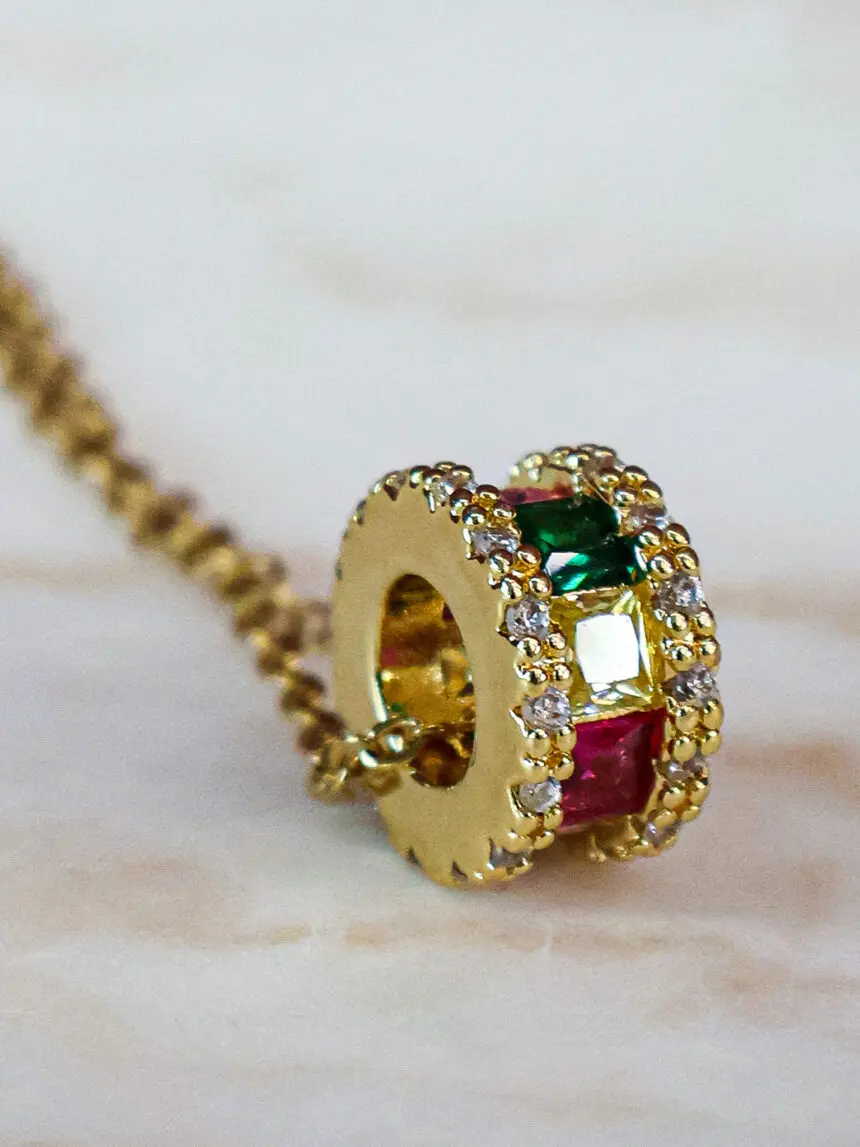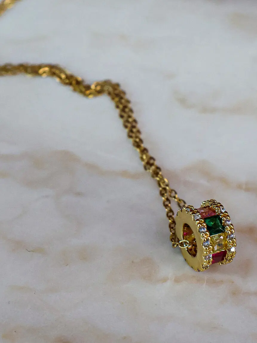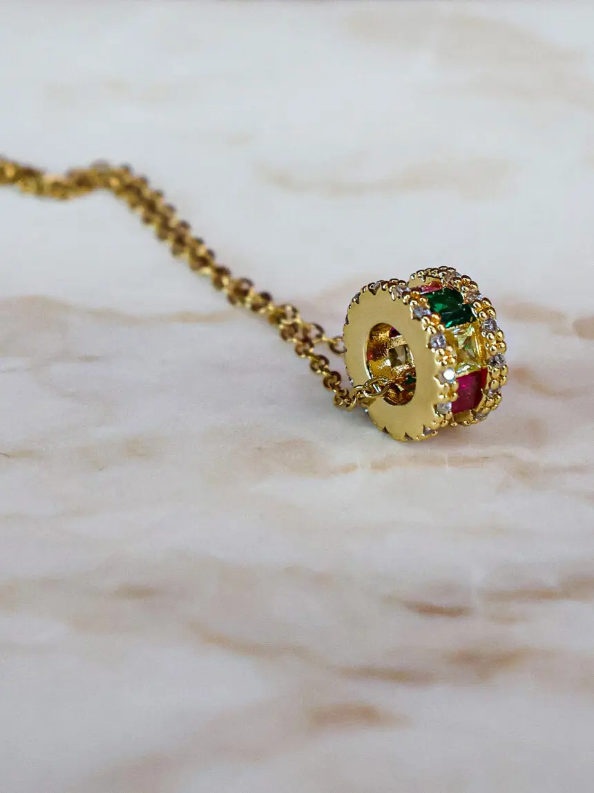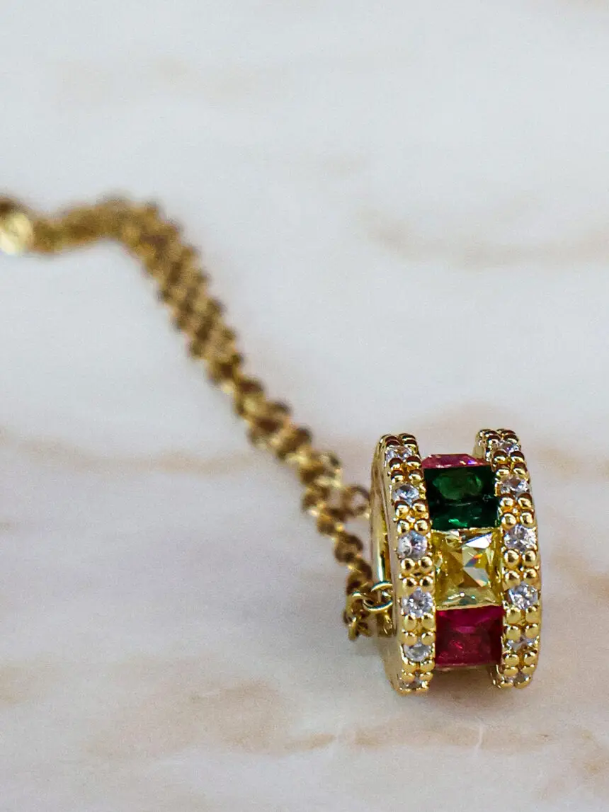 Κολιέ με εντυπωσιακό μενταγιόν σε κυλινδρικό σχήμα, διακοσμημένο με πολύχρωμες πέτρες (πράσινο, κίτρινο, κόκκινο) και λεπτομέρειες από λευκά κρυστάλλια. Σε χρυσό τόνο, προσφέρει λάμψη και χρώμα σε κάθε εμφάνιση. Ιδανικό για να φορεθεί μόνο του ως statement κομμάτι ή σε layered συνδυασμούς.