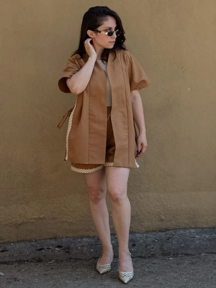 Το Sahara Kimono Blazer είναι η ιδανική επιλογή για να δώσεις στιλ σε κάθε σου εμφάνιση, χωρίς να θυσιάζεις την άνεση. Με relaxed γραμμή, ζωνάκι στη μέση και χειροποίητο crochet τελείωμα στα μανίκια και στο πατιλέτο, προσφέρει ένα boho-chic αποτέλεσμα που φοριέται από το πρωί μέχρι το βράδυ.