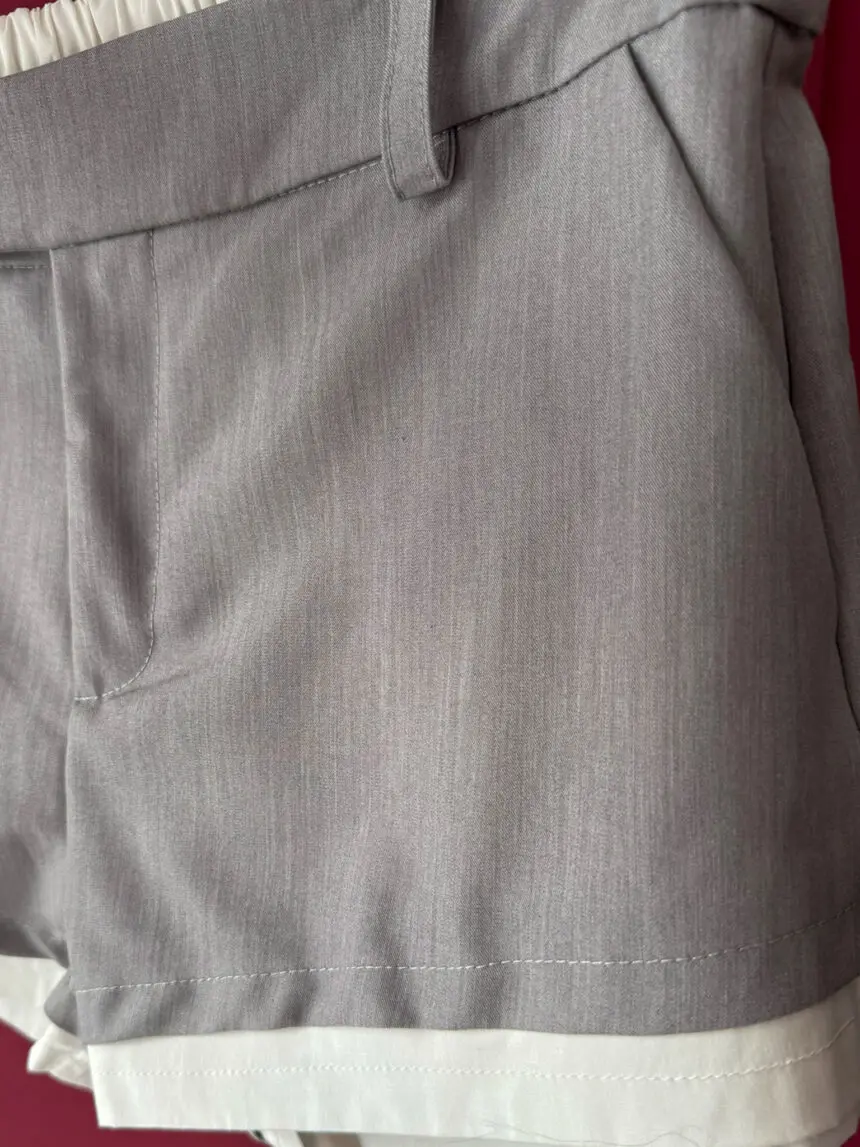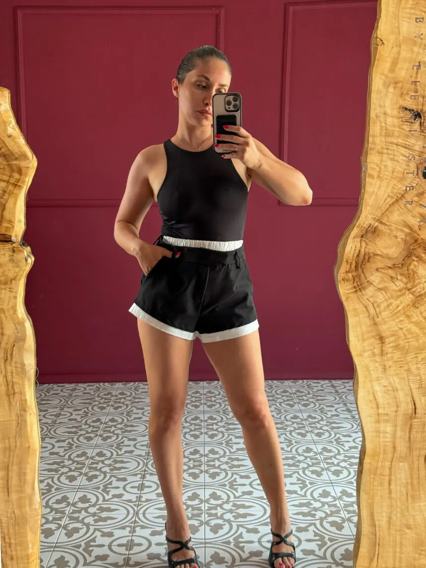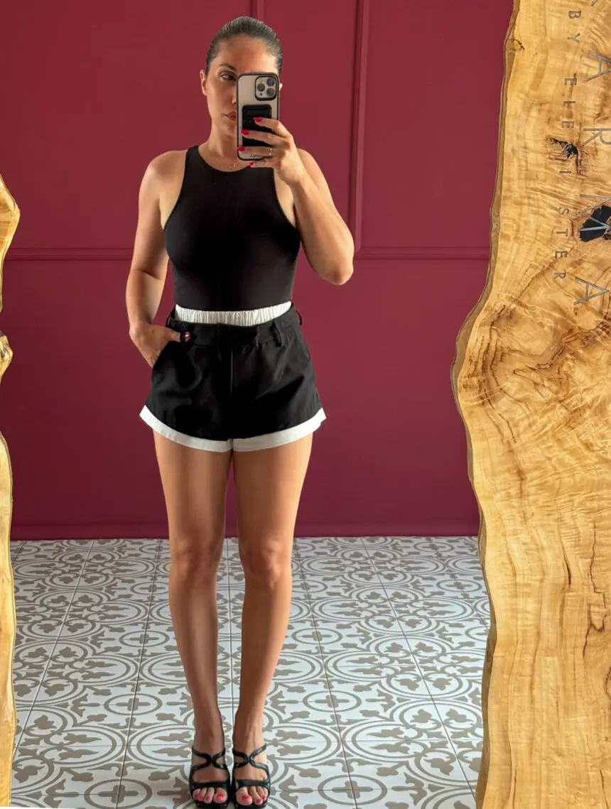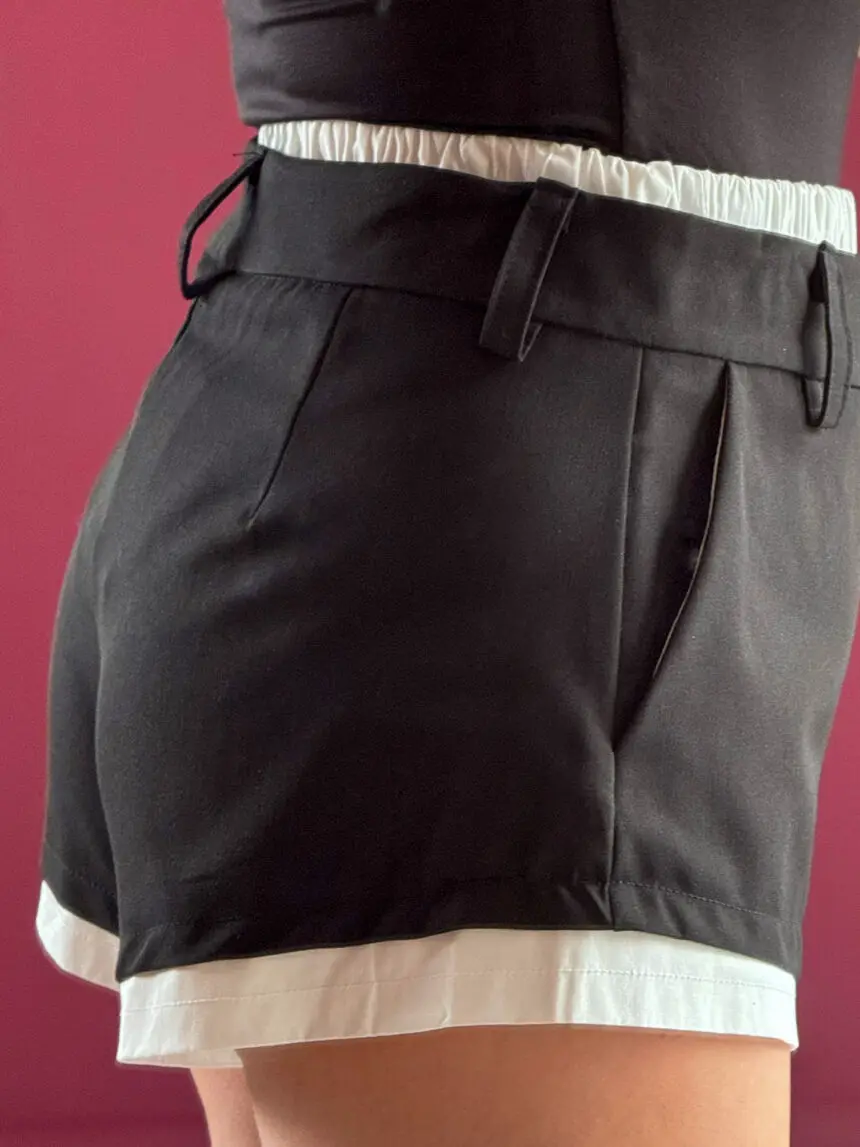 Ψηλόμεσο σορτς με ιδιαίτερο δίχρωμο design και άνετη γραμμή. Διαθέτει διακριτικές πιέτες, πλαϊνές τσέπες και ζώνη για ζωνάκι. Ο διπλός ποδόγυρος σε αντίθεση χρώματος προσθέτει στυλ και χαρακτήρα. Μπορεί να φορεθεί με sneakers για casual εμφανίσεις ή με σανδάλια/τακούνια για πιο κομψό look.