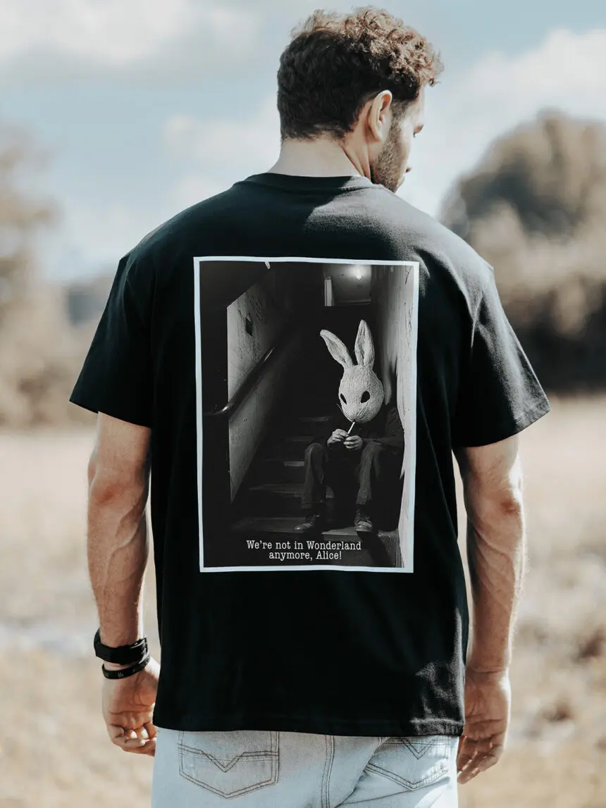 Η κλασική ιστορία της Αλίκης, όπως δεν την έχεις ξαναδεί. Το “Wonderland” T-shirt φέρνει μια σκοτεινή, αστική εκδοχή του παραμυθιού στην καθημερινότητά σου, μέσα από ένα έντονο ασπρόμαυρο print που απεικονίζει μια αλλόκοτη φιγούρα με μάσκα κουνελιού σε σκηνικό υπόγειου.
